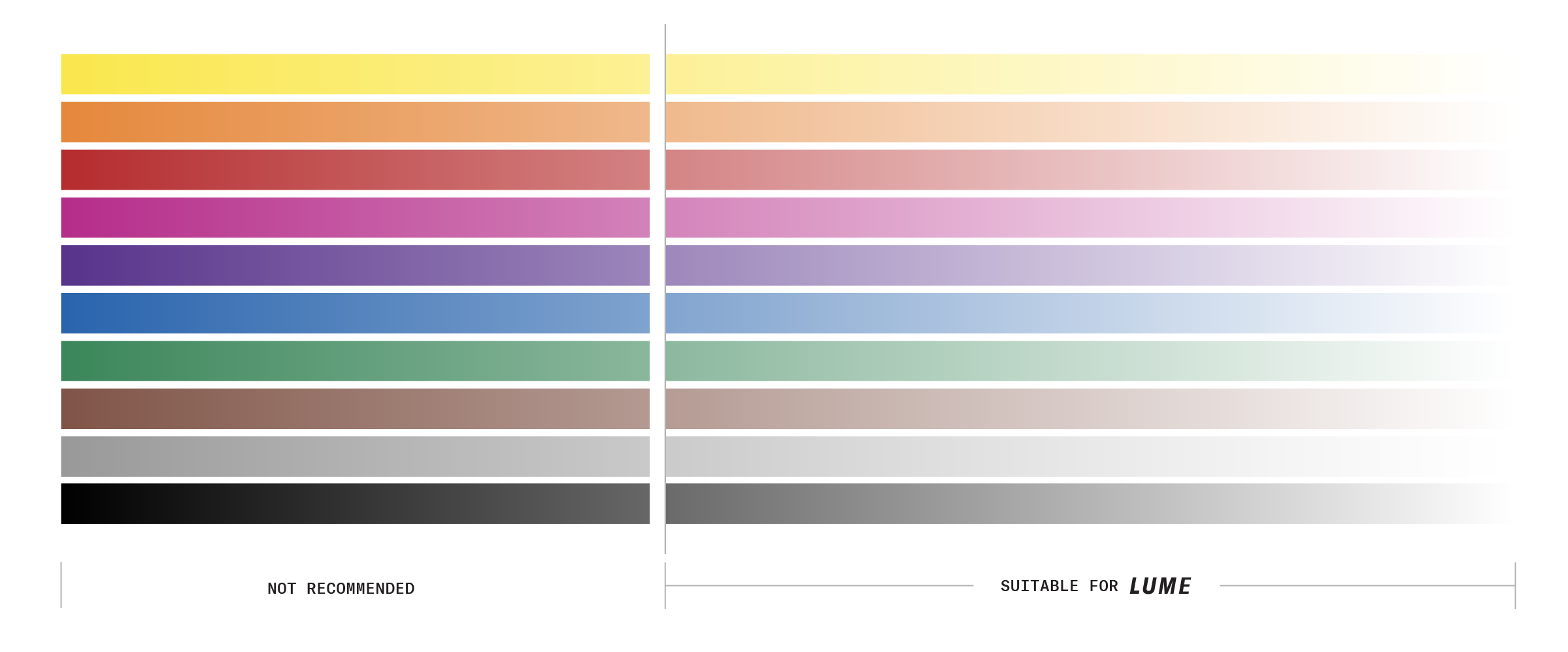 LUME works best on solid colours and pigments.